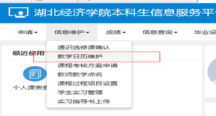 1.教务处网站主页登录新版教务管理系统,点击“信息维护-教学日历维护”。