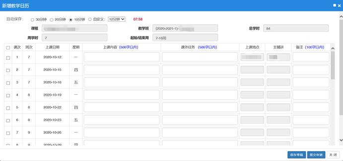 3.“新增教学日历”页面中“课程名称”“教学班信息”“总学时”“周学时”“起止周”“周次”及“上课日期”已根据教师的教学任务及课表信息自动生成,教师可自行设置教学日历自动保存时间。