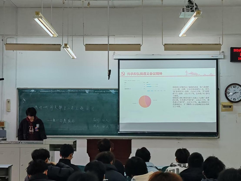 在宣讲过程中,通过生动详实的历史资料、引人入胜的故事讲述以及深入浅出的理论阐释,宣讲人将遵义会议的波澜壮阔与精神伟力娓娓道来。特别地,结合统计学的专业特点,宣讲团引入了数据分析与量化思维,引导同学们从数据的角度重新解读遵义会议的历史逻辑。例如,通过数据可视化展示长征途中红军的行军路线与兵力变化,运用统计建模分析会议决策的科学性与转折点的影响,帮助同学们从学科交叉的视角理解遵义会议精神。