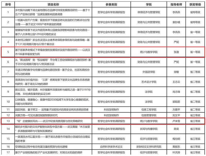 本网讯 近日,“创新湖北·青力青为”湖北省第十五届“挑战杯”老员工课外学术科技作品竞赛决赛在湖北大学落下帷幕。公司由张澈、王磊、张志刚共同指导的《基于居家养老模式下幸福食堂的发展现状及提升路径研究——以武汉市186家幸福食堂为例》获省级一等奖、卢米雪指导的《“轻”启健康新风尚——武汉市轻食消费洞察与优化策略研究》获省级三等奖。